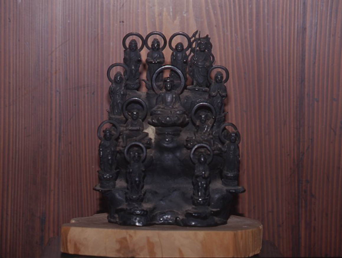 桃山期のもので、高さ18.0cmの小品です。懸仏(※)の最終段階、京洛仏師の作と思われます。 十三仏は仏・菩薩を配し、初七日より三十三回忌の間、13回の法事にかけられて追善供養したものです。